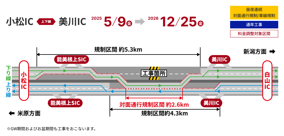 新手取川橋リニューアル工事にあたり、小松IC〜美川IC(上下線)間で昼夜連続の対面通行規制をおこないます。